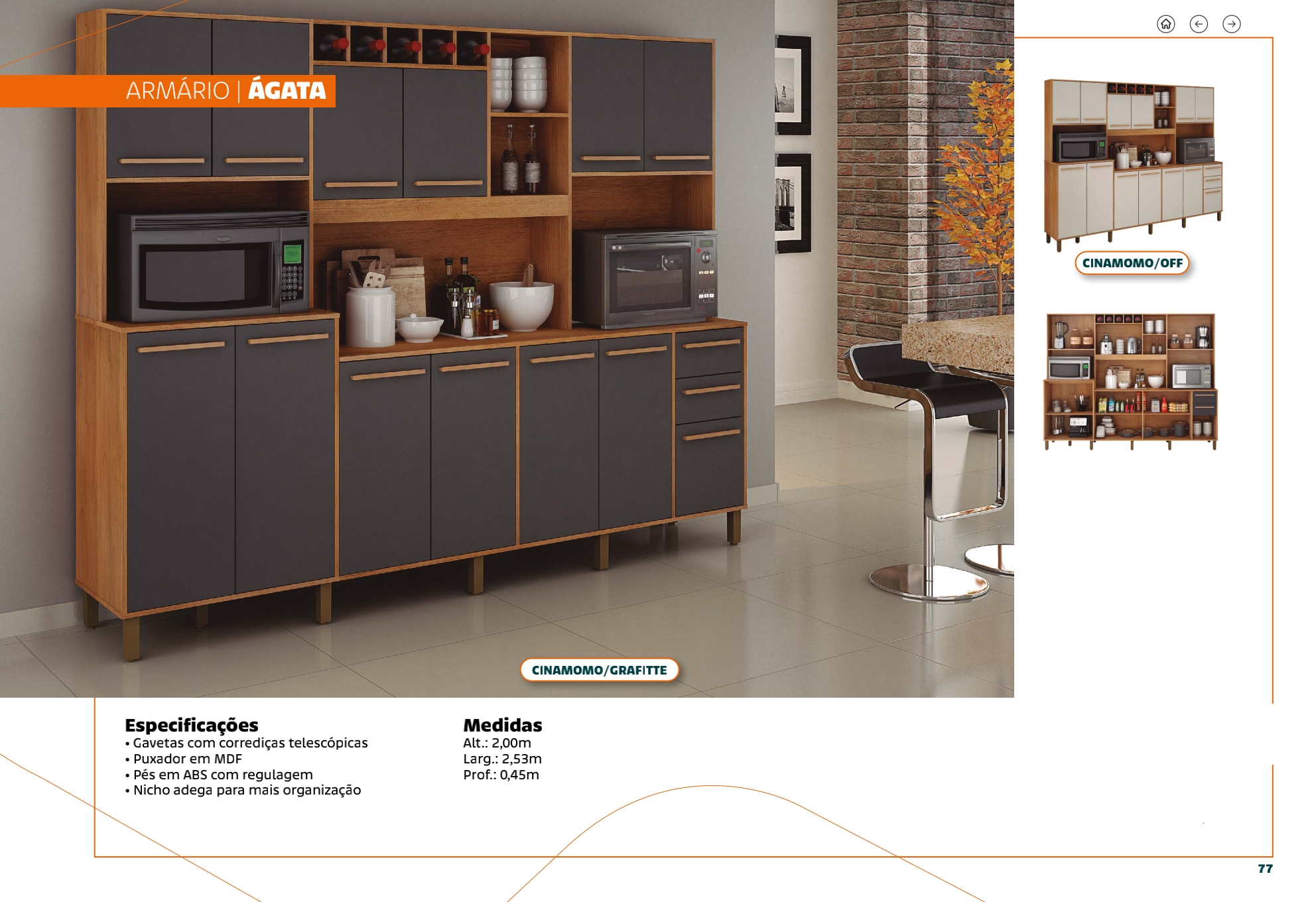 Um dos diferenciais do Armário Ágata é seu nicho para adega, ideal para armazenar suas bebidas com estilo e praticidade, tornando o ambiente ainda mais acolhedor. Com um design contemporâneo nas cores cinamomo e grafite, ele combina perfeitamente com diferentes estilos de decoração, seja em cozinhas modernas ou rústicas.