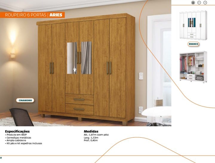 Compatibilidades e Acessórios Inclusos: Além do kit pés e espelhos, o roupeiro é compatível com diversos ambientes, adaptando-se facilmente a quartos de diferentes tamanhos e estilos. Venha descobrir como o Roupeiro 6 Portas Aries pode transformar seu espaço de forma prática e estilosa!